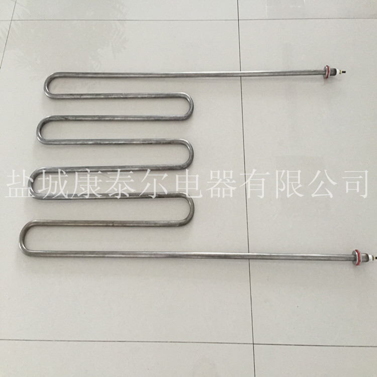 法蘭式不銹鋼加熱管(也稱插入式電加熱管):是采用U型管狀電熱元件,依據加熱不同介質設計規范,按照功率配置要求裝配在法蘭蓋上,插入需加熱物料中,發熱元件工作時所發出的大量熱量傳導給被加熱介質使介質溫度升高,達到所需的工藝要求。